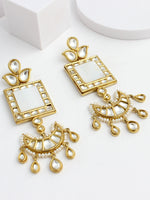 Gold plated long earrings studded with simulated diamond polkis and natural mother of pearl.