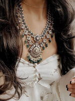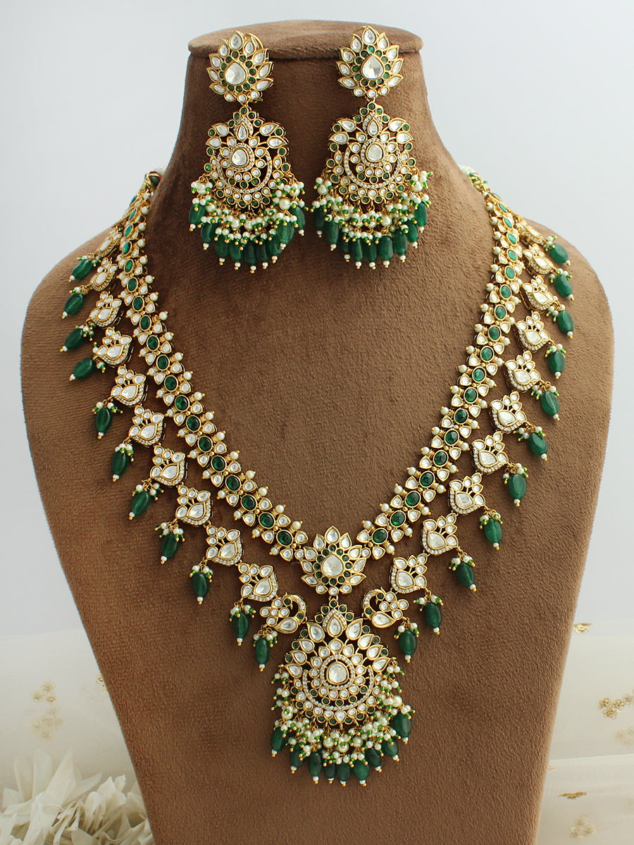 Introducing our Gold-Plated 2 Layered Necklace Set, elegantly studded with simulated diamond polkis, CZs, green stones and beads, for a timeless and regal look.