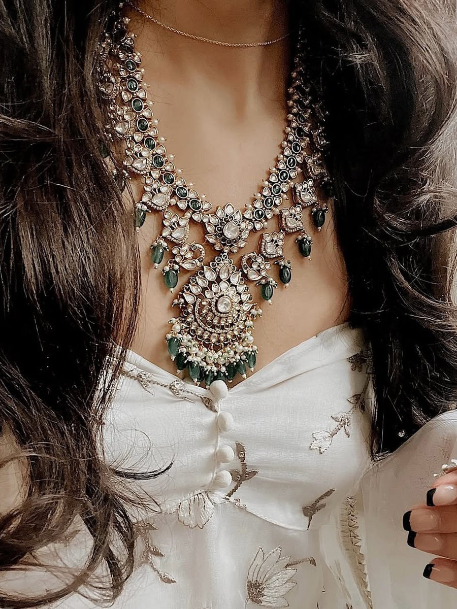Crafted with meticulous attention to detail, this necklace set exudes sophistication with its simulated Polki Diamonds, CZs, stones embellishments. The adjustable cord ensures a comfortable fit for all neck sizes, and the matching earrings complete the set create an exclusive bridal look. Embrace tradition with allure of the Mansvi Necklace Set..
