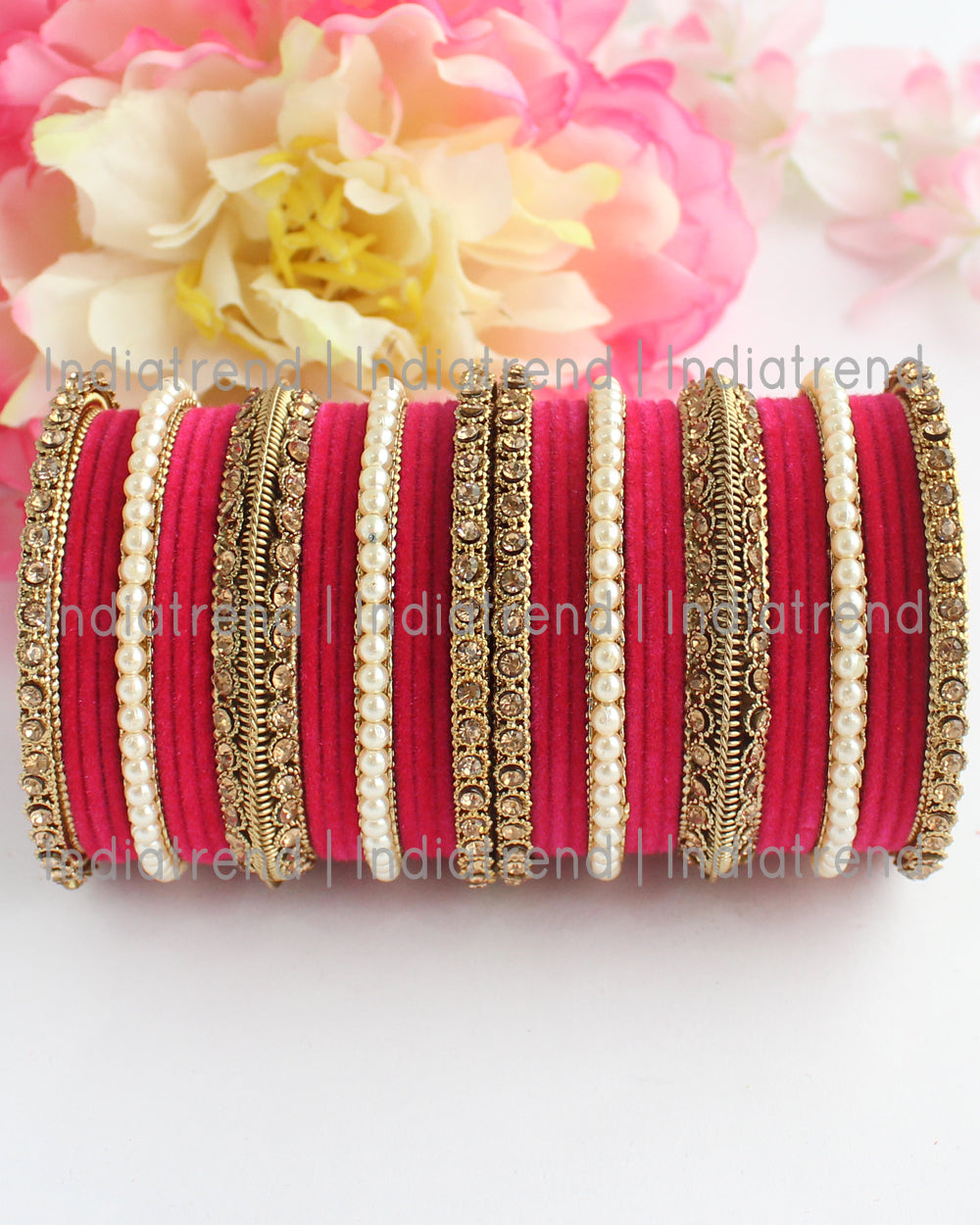 The 34 PC Velvet Bangle Set Studded with Faux Pearls & CZs is a luxurious and elegant collection of bangles. Here are the details: