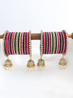 A striking fusion of elegance and traditional charm, this 54-piece bangle set features vibrant hot pink and green velvet bangles adorned with simulated Polkis and faux pearls. The highlight of the set is the beautifully crafted jhumki hangings, adding a regal and festive flair to your look.