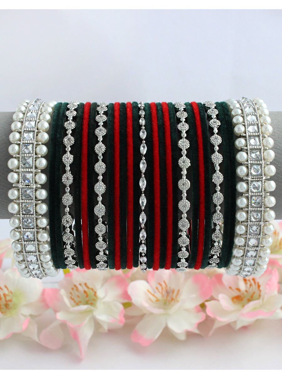 27 PC Pink & Blue Velvet Bangle Set Studded with Simulated Polkis and Faux Pearls.