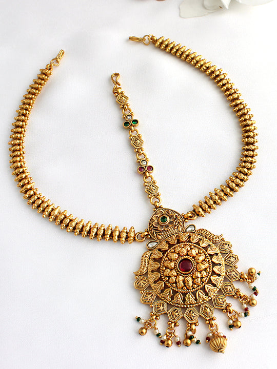 Introducing our Gold Plated South Indian Style Mathapatti Headpiece adorned with Simulated Hot Pink, Green Stones and Golden beads for a regal and traditional touch. Crafted on a base of high-grade alloy metal, this Mathapatti beautifully captures the essence of South Indian jewelry, infusing it with modern elegance for a timeless and sophisticated look.