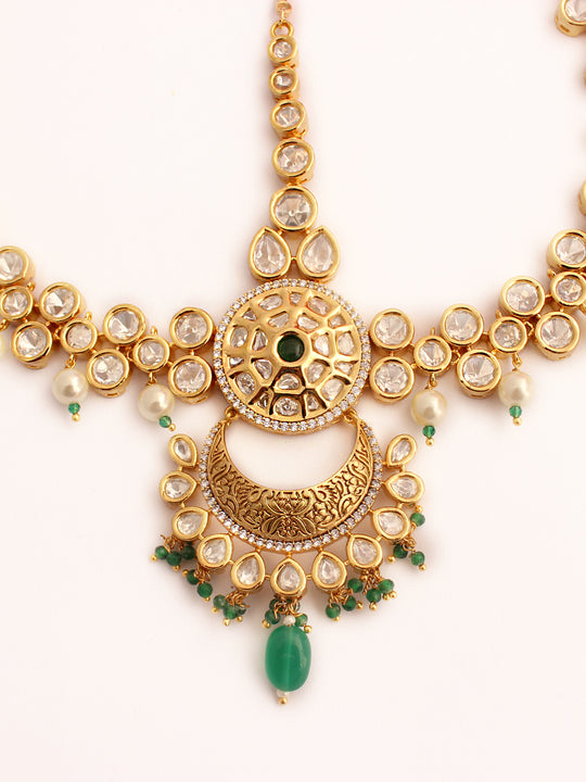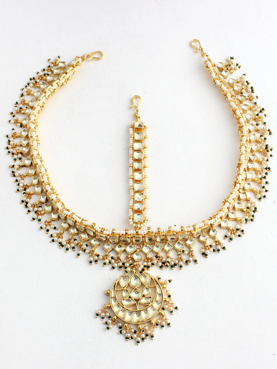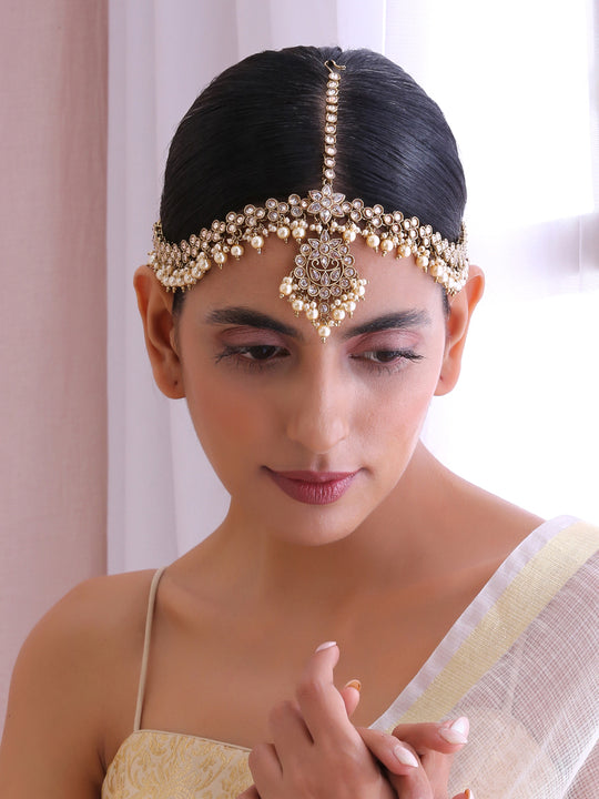 This mathapatti headpiece is crafted with intricate detailing, featuring a beautiful combination of simulated polkis, faux pearls, and colorful stones. The adjustable design ensures a comfortable fit for any bride, adding a regal touch to the overall bridal ensemble. Perfect for wedding ceremonies and special occasions.