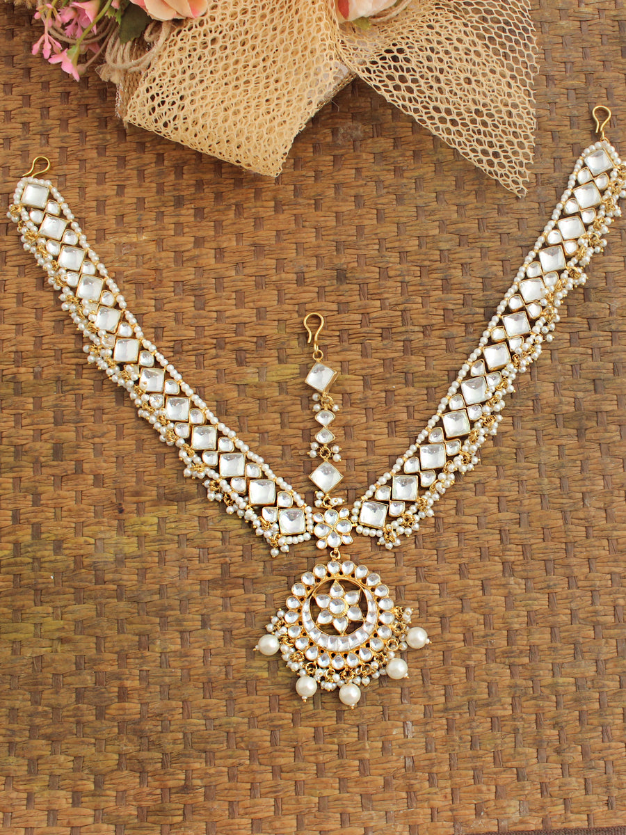 - Traditional Indian Gold Plated Mathapatti Studded with Simulated Kundan and Faux Pearls.