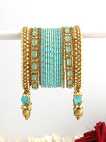 Introducing our 18 PC Gold Tone Turquoise Bangle Set, a beautiful fusion of elegance and traditional design. This exquisite set is crafted with simulated Polki bangles, faux pearls, and stones, offering a luxurious touch to any outfit. Note: This set is for one hand only.