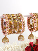Introducing a dazzling Gold tone pastel pink bangle Set, adorned with Czs, faux pearls, simulated polkis and stones, for a touch of sophistication and glamour.crafted from high-grade alloy metal. The intricate design and sparkling stones make it a perfect accessory for special events and celebrations. This set includes both hands' worth of bangles and features intricate detailing.