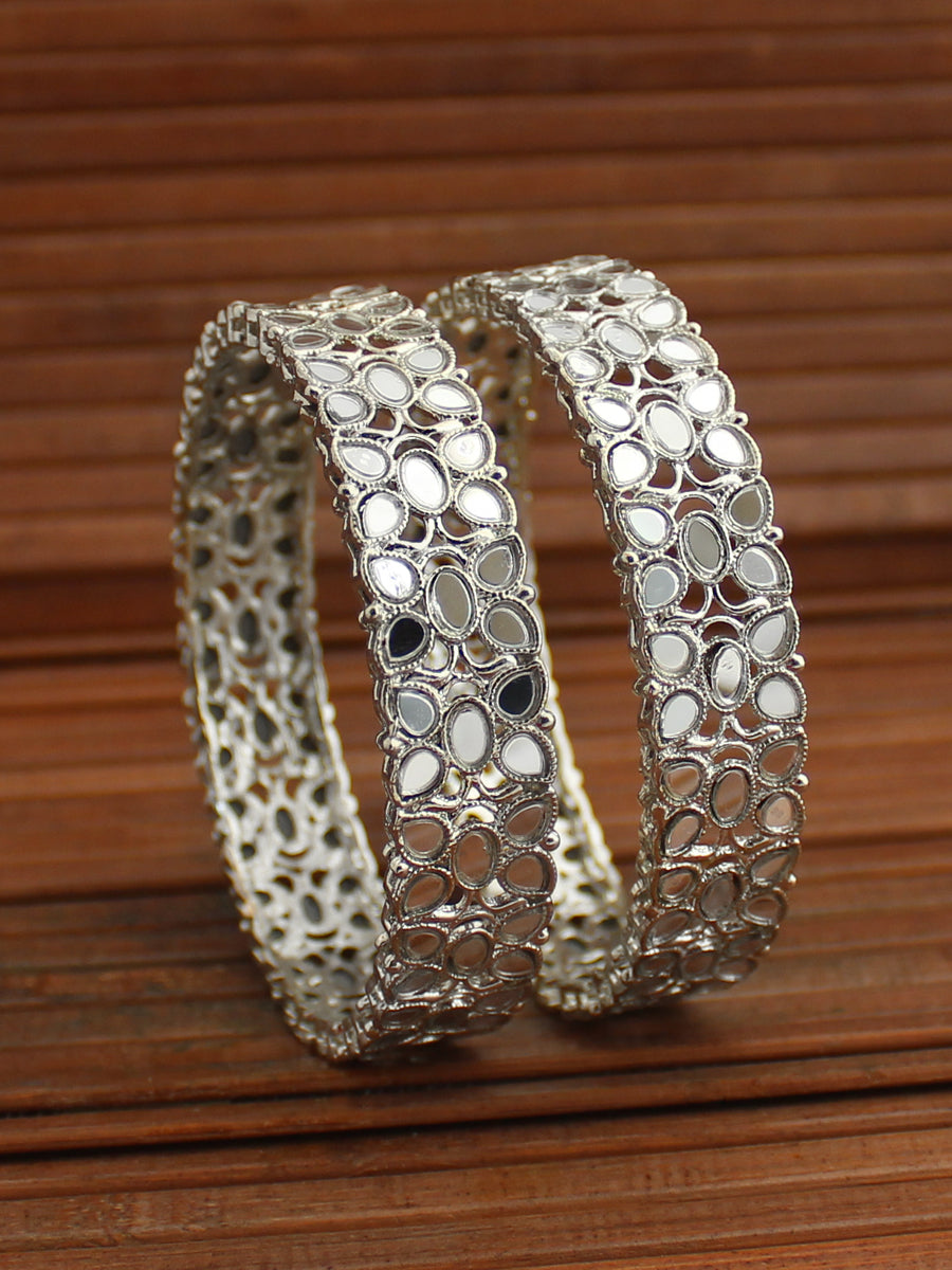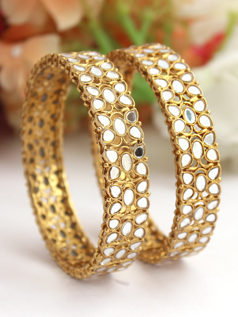 These bangles showcase a perfect blend of elegance and tradition, with the antique gold tone lending a vintage charm. The simulated faux pearls, polkis, and mirrors add intricate detailing, creating a piece that effortlessly complements various ethnic and traditional outfits. Crafted from high-grade alloy metal, these bangles promise durability and a classic appeal.