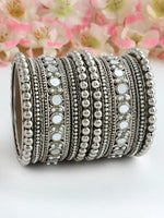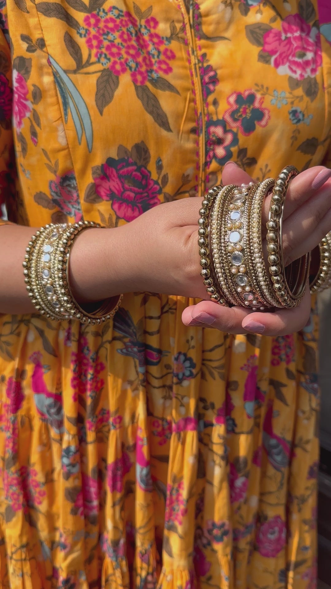 Enhance your jewelry collection with these versatile and charming bangles. The combination of faux pearls and mirrors creates a captivating aesthetic, making these bangles a perfect addition to your ethnic wardrobe. Please note that the listing is for one set only.
