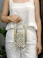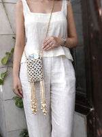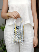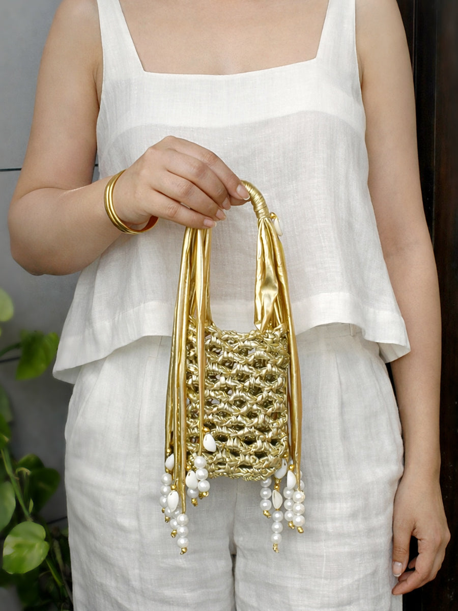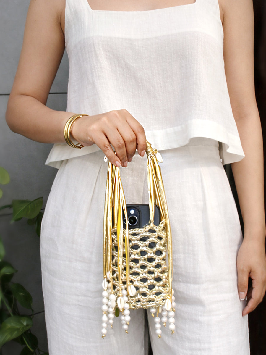 Introducing our Alina Crochet Mobile Bag — a striking statement piece handcrafted in shimmering silver and metallic gold fabric. Adorned with playful pearl and shell detailing, this compact yet eye-catching bag is designed to carry your phone.