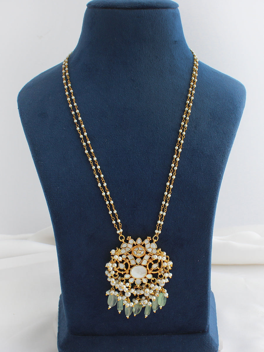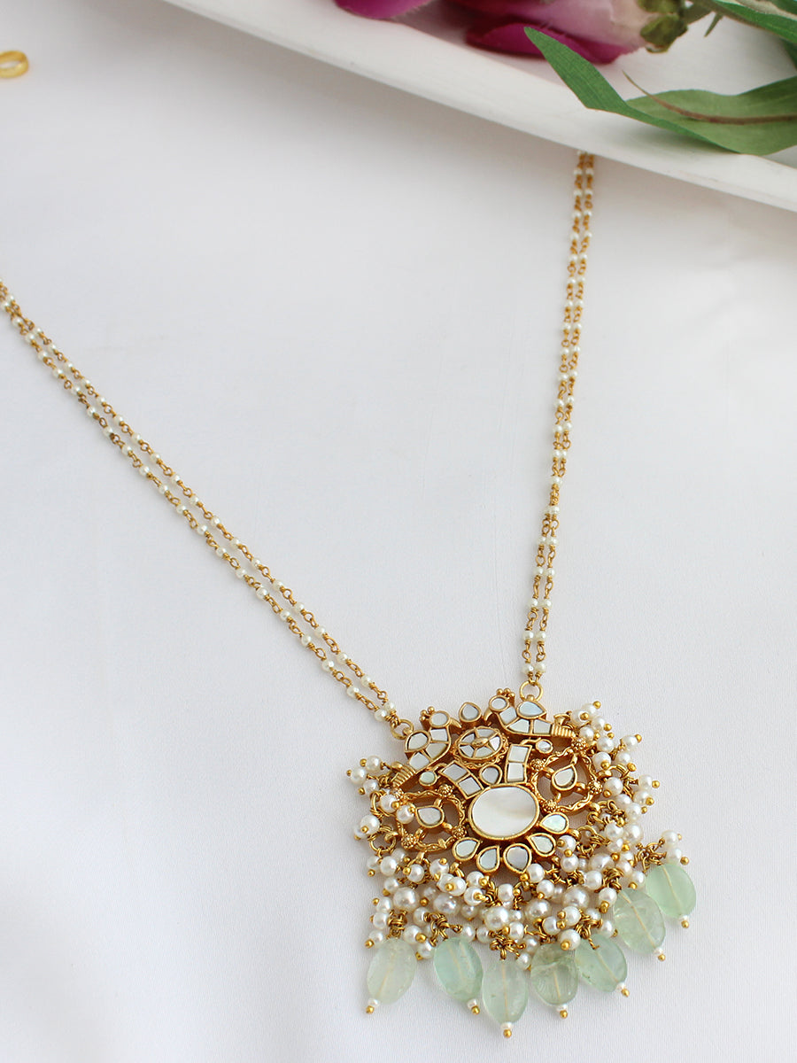 Introducing our Gold Tone Long Pendant Necklace, adorned with natural mother of pearls and beads for a graceful and timeless look. Crafted on a base of high-grade alloy metal. The Mother of pearl material's iridescence and smooth texture make it versatile and suitable for both casual and formal occasions.