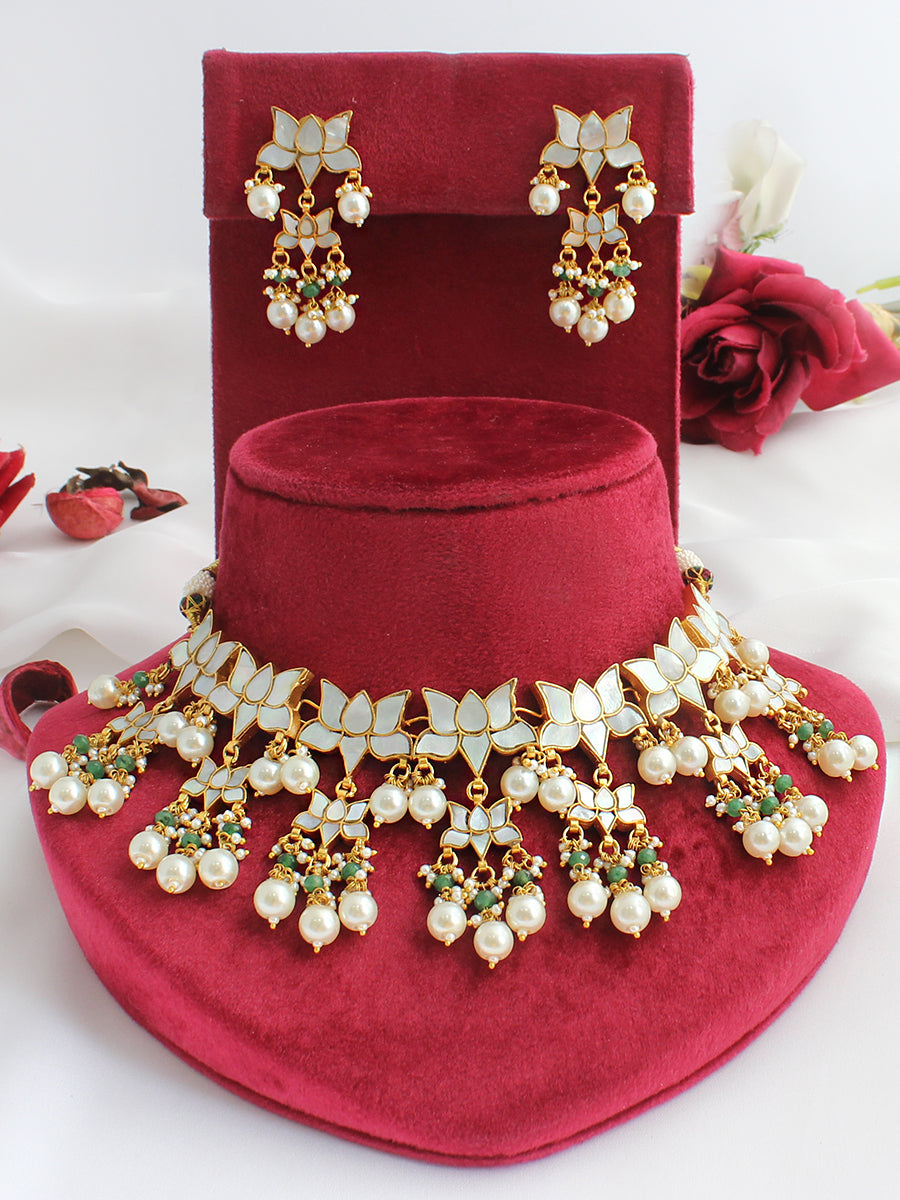 Gold-Plated Lotus (Kamal) Bib Necklace Set with Mother of Pearl and Beads. Make an elegant statement with this stunning lotus flower-shaped bib necklace set, beautifully gold-plated and adorned with natural mother of pearl and delicate beads. The graceful floral design evokes timeless charm, while the shimmering iridescence of mother of pearl adds a luxurious glow.Featuring an adjustable cord for a perfect and comfortable fit, and paired with matching post-back earrings for ease of wear, this set is as practical as it is beautiful. Whether you're dressing for a formal event or adding flair to a casual ensemble, this versatile piece transitions seamlessly across occasions.