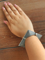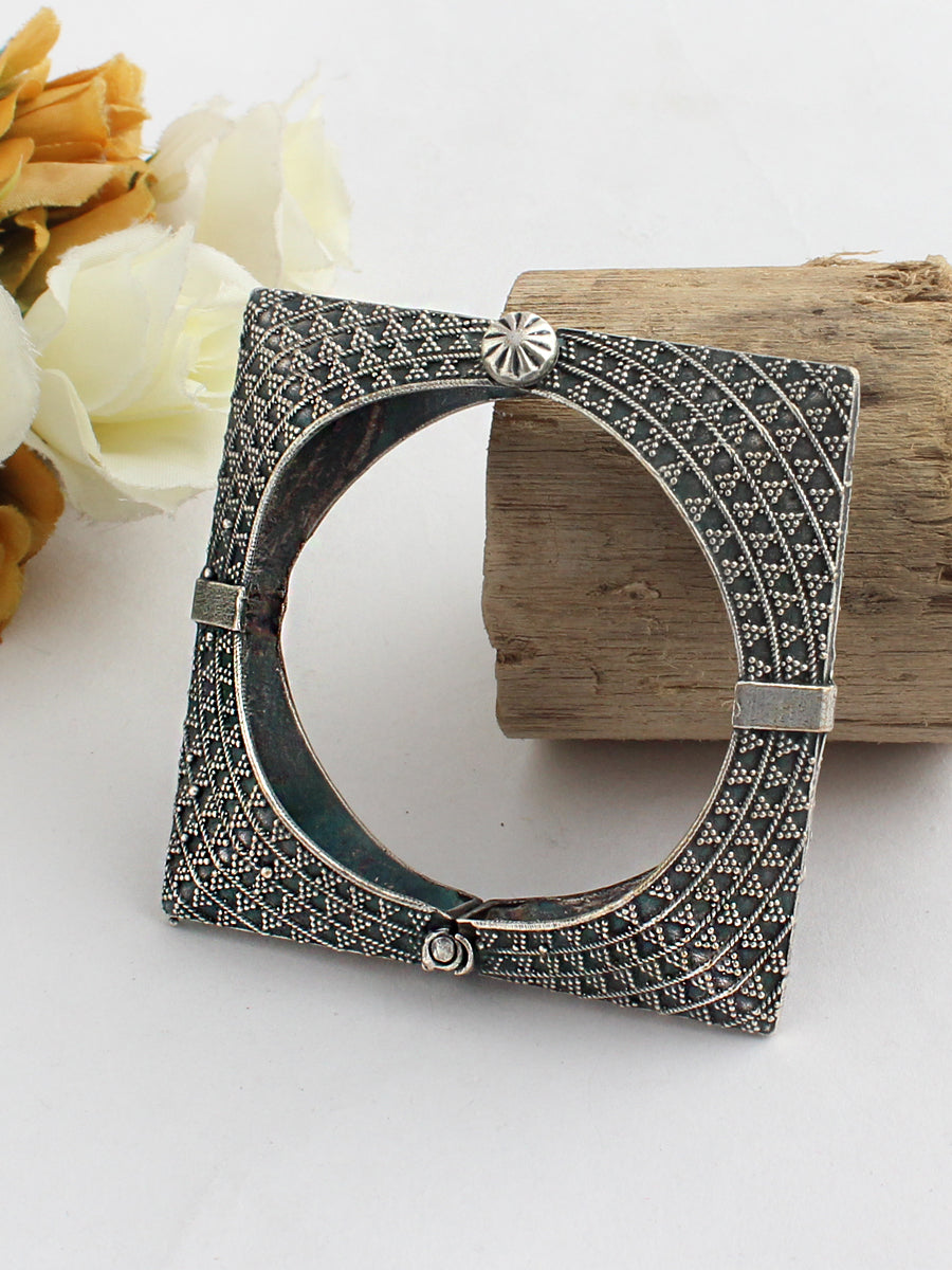 The oxidized silver tone boho bangle has a size of 2.4 or 2.25" in diameter with a screw opening. The base is made of high-grade alloy metal.