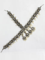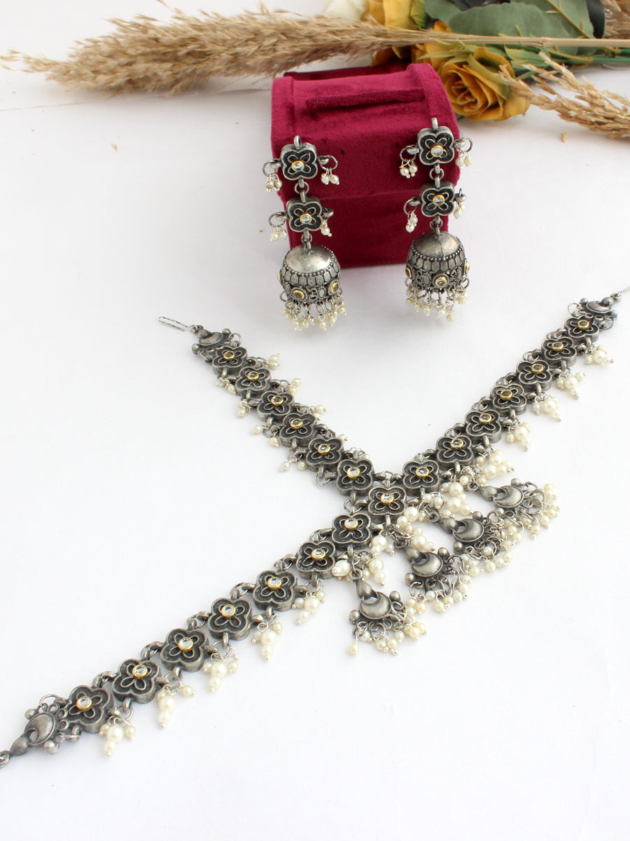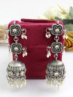The oxidized silver-tone dangle jhumka/jhumki earrings are adorned with simulated kundans and faux pearl beads.