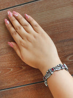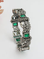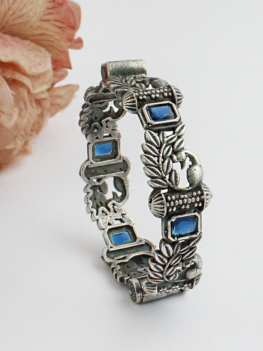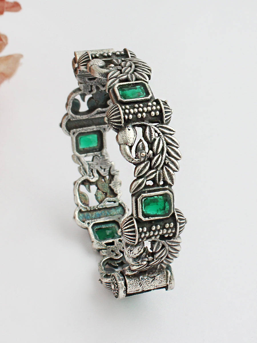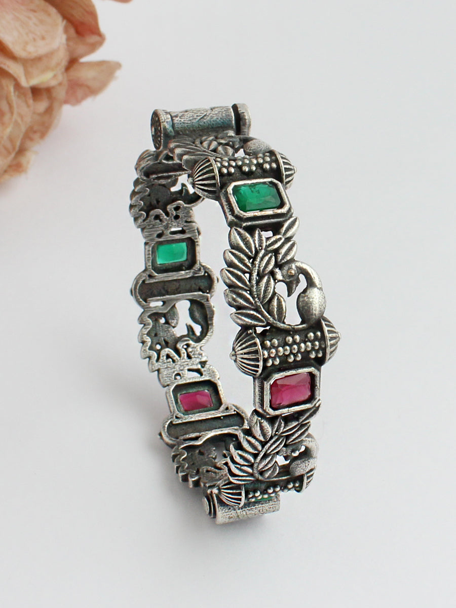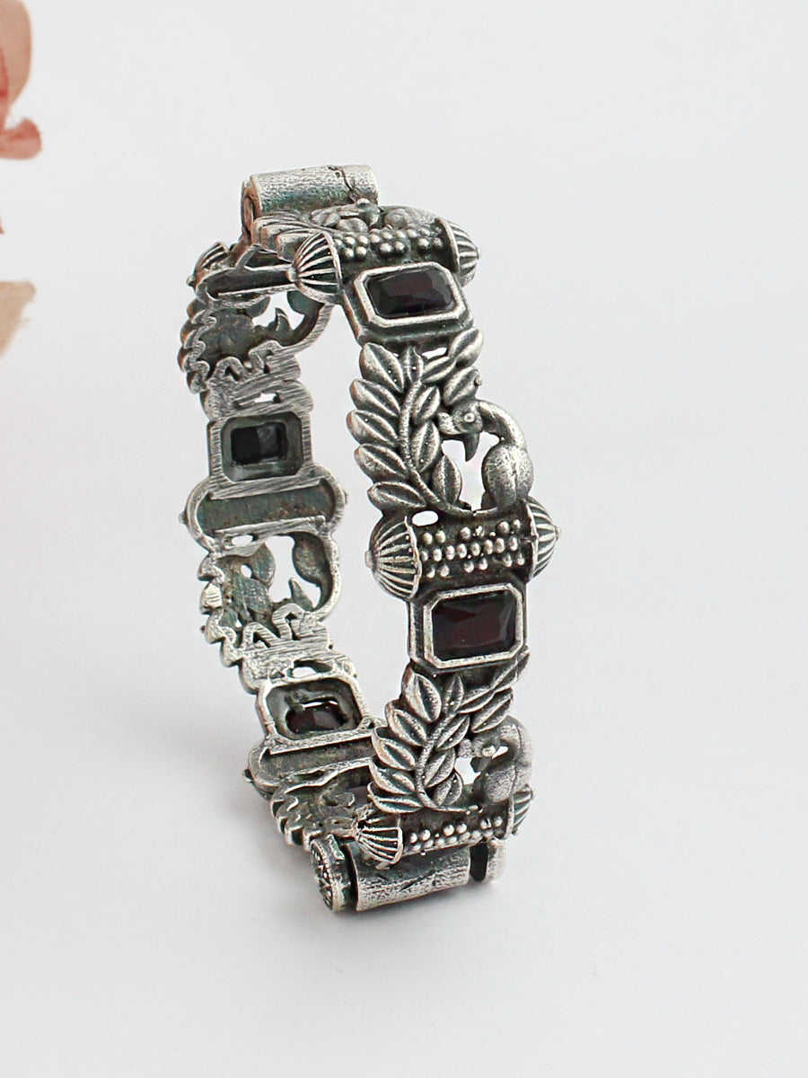 Introducing an Oxidized Silver Tone Peacock Bangle adorned with Simulated Ruby Pink Stones, a distinctive piece with traditional charm: