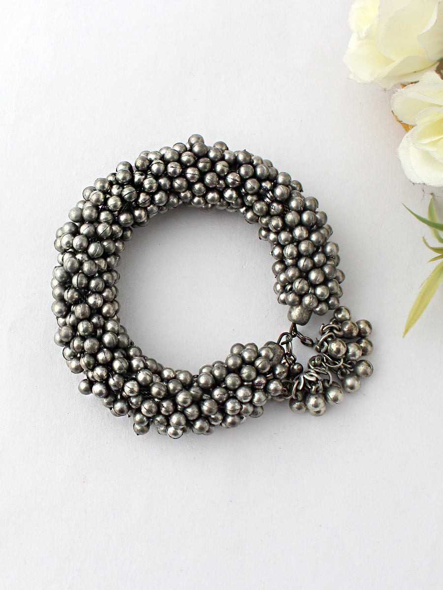 The oxidized silver-tone boho jhumki bangle/bracelet comes in one piece with an adjustable size. The base is made of high-grade alloy metal.