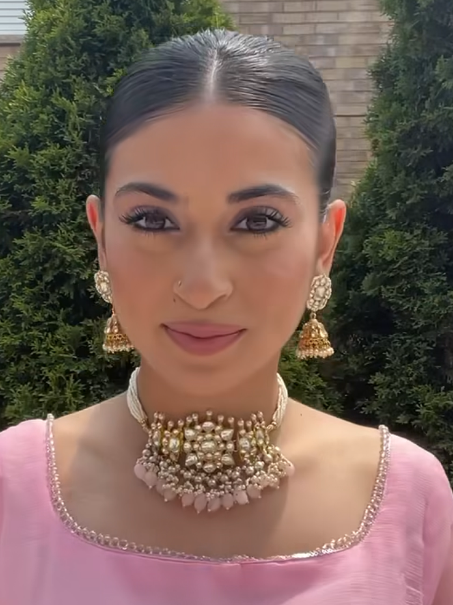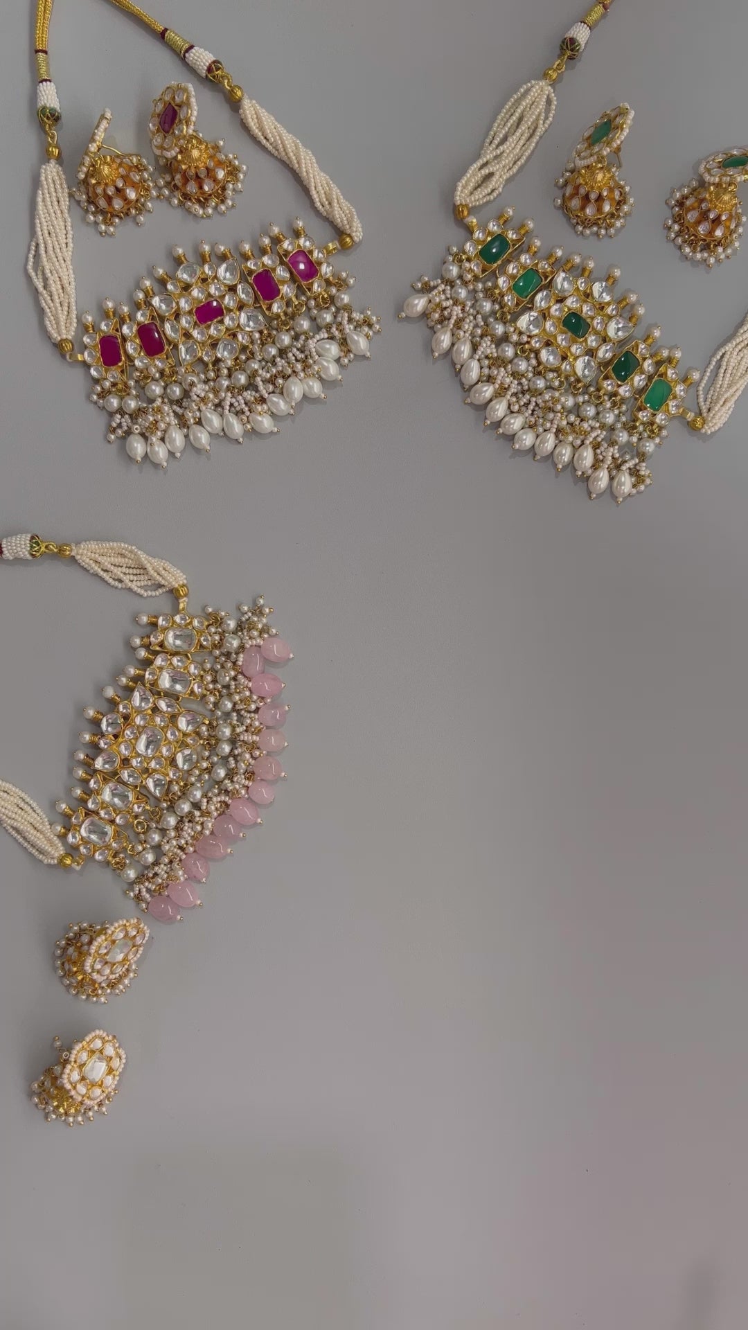 This set features simulated kundan, faux pearls, mother of pearl, and green and hot pink stones and beads, creating a beautiful and vibrant look. The adjustable cord ensures a comfortable fit for various neck sizes. It's a perfect choice for an elegant and traditional ensemble.
