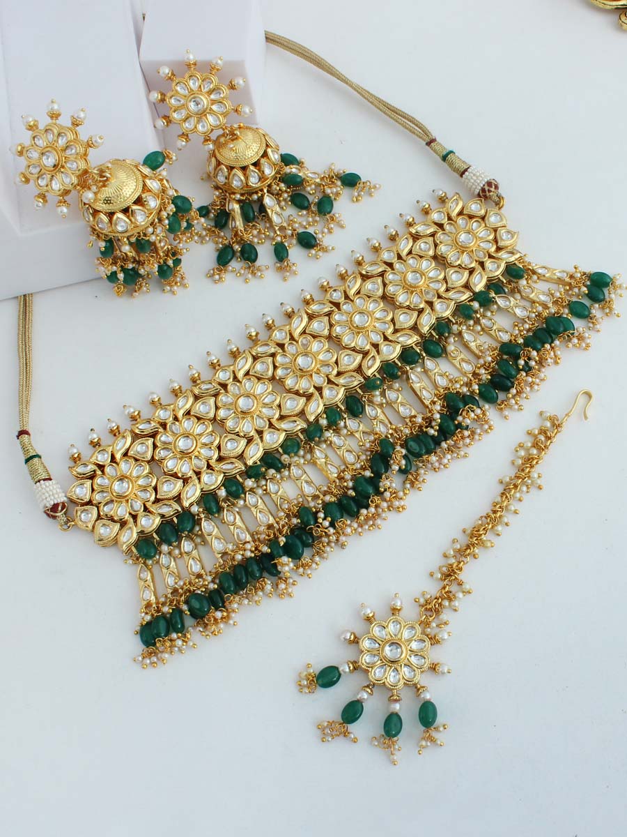 Gold Tone Choker Necklace Studded with Simulated Polki diamond, Faux Pearls & dangling Beads.