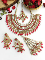 This set is designed to make a statement with its intricate detailing and vibrant combination of faux pearls, multicolored stones, and beads. The adjustable cord on the necklace ensures a comfortable fit for all neck sizes, and the set is completed with matching earrings, tikka, and a stunning jhoomer for a cohesive and elegant look.