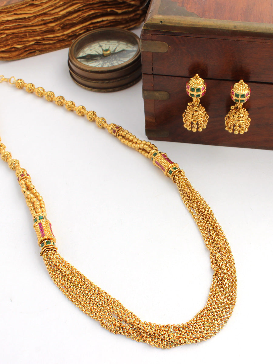 Our Gold Plated South Indian Style Necklace Set. adorned with Pearl beads for a regal and traditional touch. Crafted on a base of high-grade alloy metal, this necklace set beautifully combines cultural aesthetics with contemporary style.