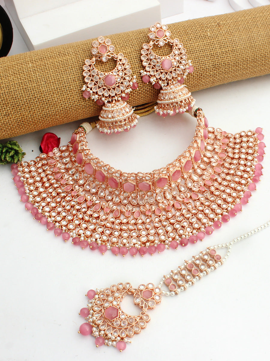 Rose Gold Finish Bib Necklace Set Studded with Simulated Polki Pastel Pink Stones & Faux Pearl Beads.