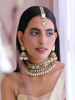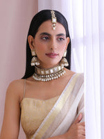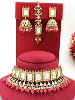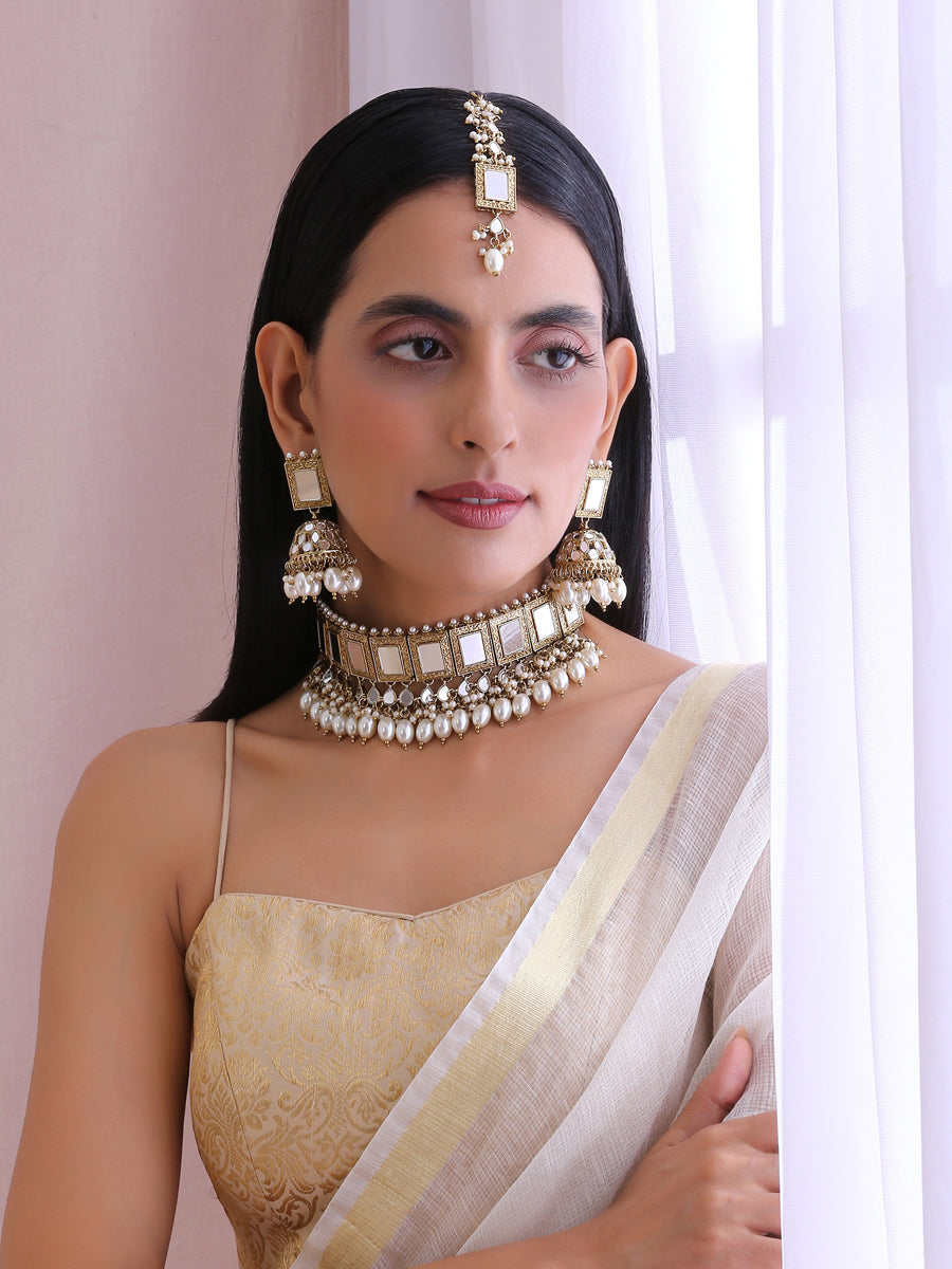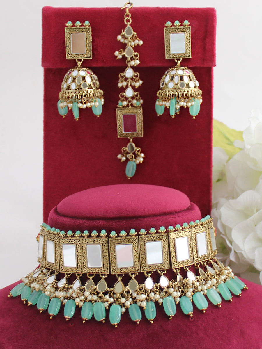 Gold Tone Choker Necklace Set Adorned With Mirrors, Faux Pearls, and Colored Beads. The necklace measures approximately 6 3/4 inches with an adjustable cord to fit all neck sizes. The earrings measure approximately 60mm in length and 25mm in width (2 1/2" x 1") with post-back findings for pierced ears. The tikka measures approximately 5 inches in length and has a width of 20mm (3/4") on the forehead side. Crafted from high-grade alloy metal.
