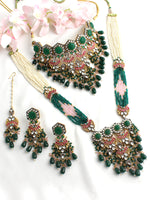 Two Tone Necklace Set Studded with Simulated Polki Diamond Hot Pink Kundan Green Carved Stones and Beads.