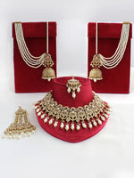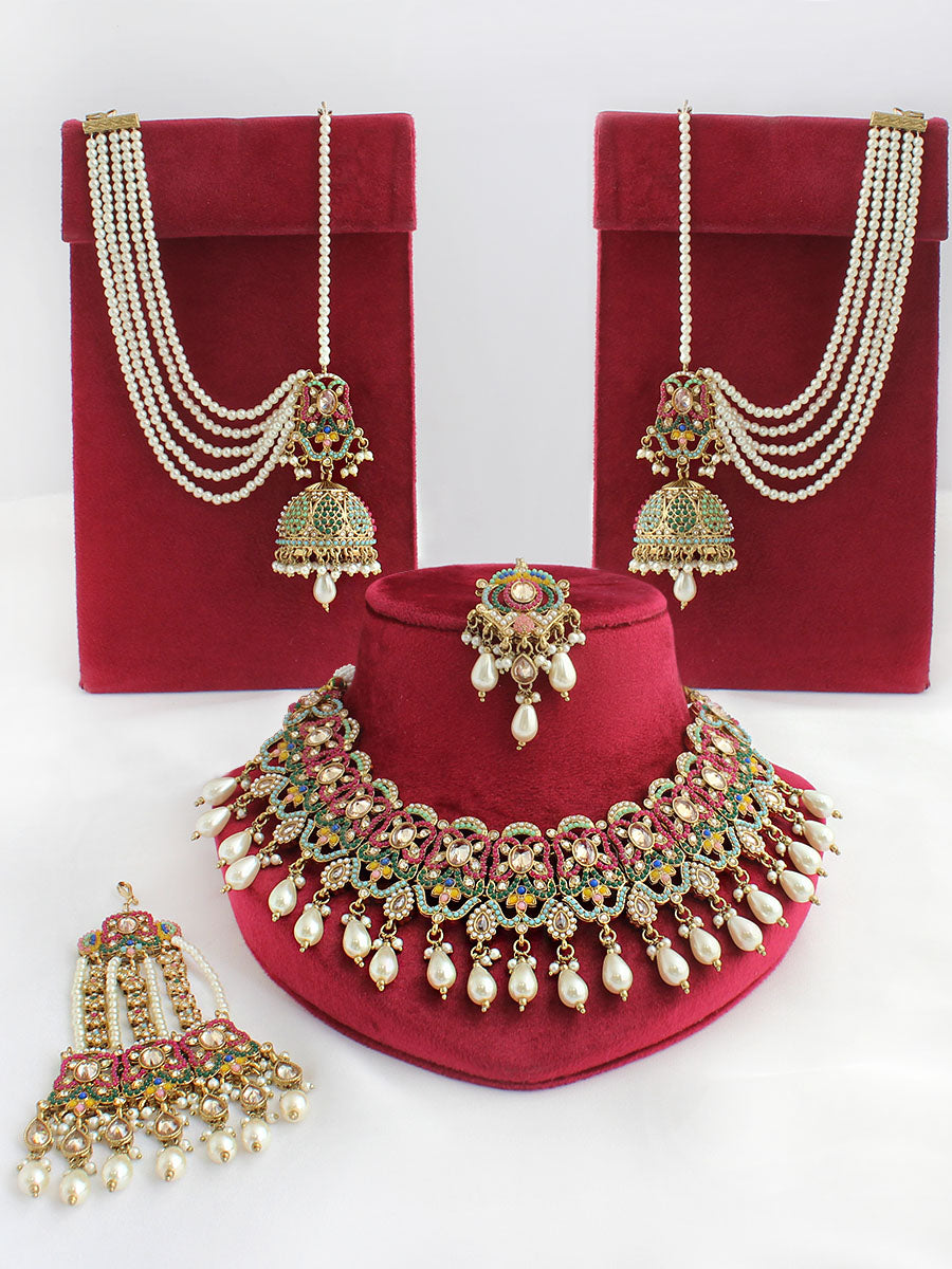 Gold / Silver Tone Necklace Set Studded with CZs Simulated Polki Multicolor Beads and Faux pearl.