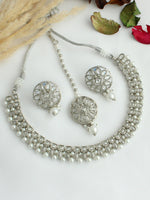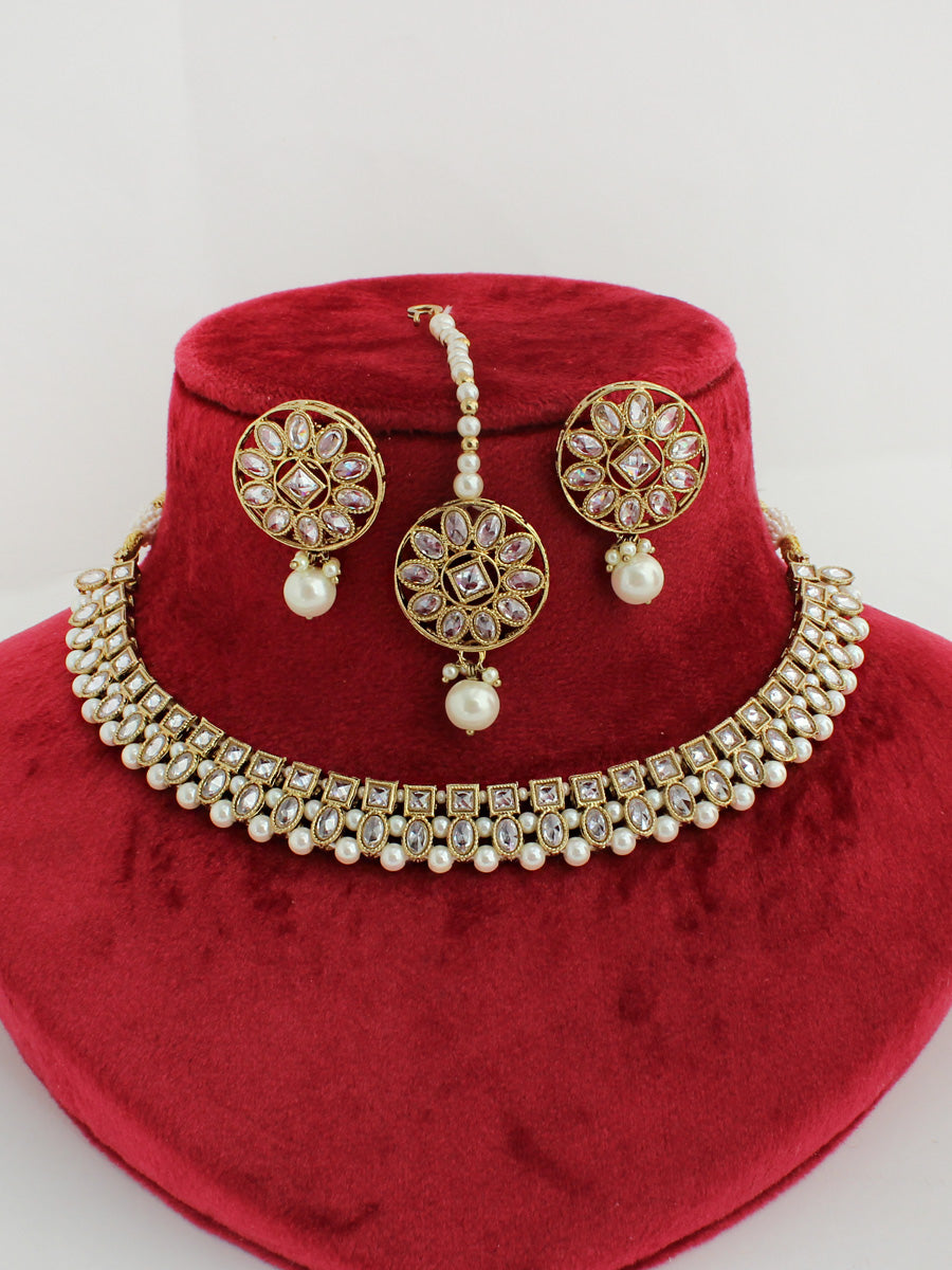 Introducing a magnificent Gold Tone Bib Necklace Set, embellished with simulated polkis and faux pearls for a regal and timeless look.
