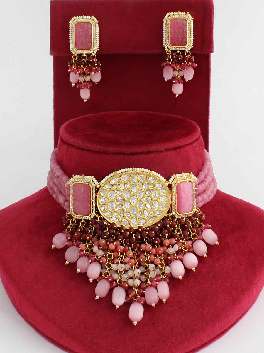 The Gold-Plated Choker Necklace Set is a stunning piece adorned with simulated polki diamond, carved stones, and shaded beads. Here are the specifications:
