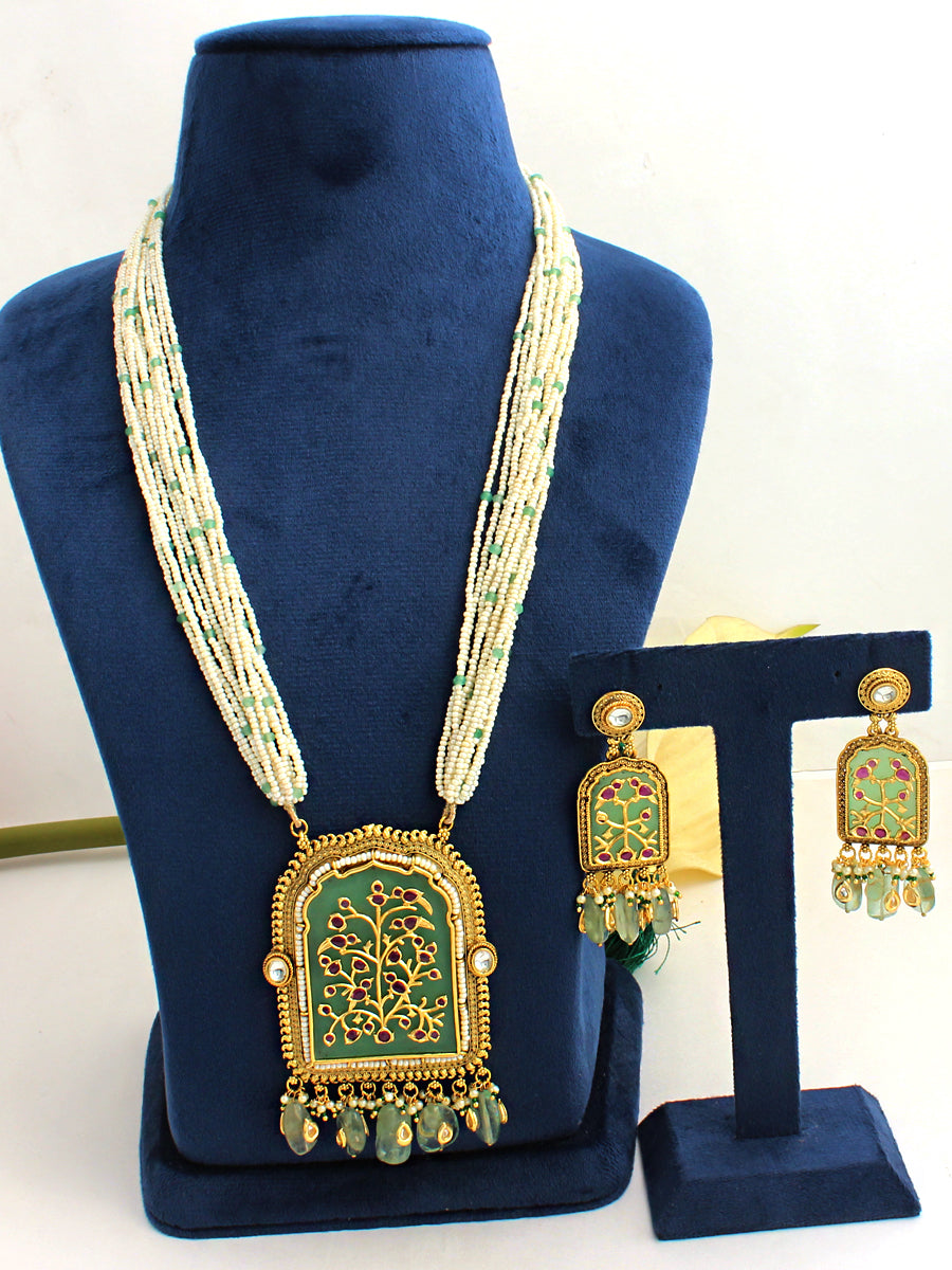 Gold Plated Long Necklace Set with Simulated Kundan and Faux Pearls