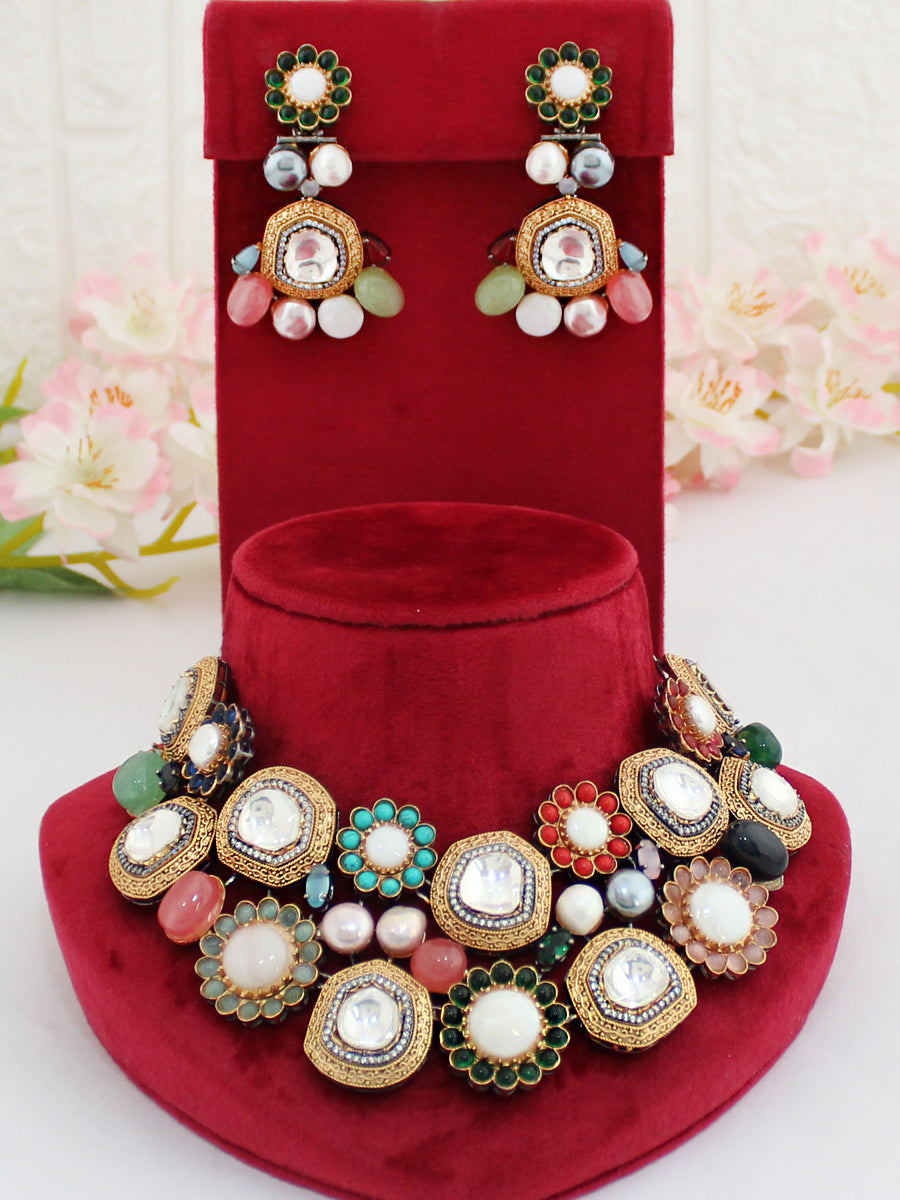 The Gold Tone Necklace Set Studded with Simulated Polki, Stones, and Beads is a stunning accessory set. Here are the details: