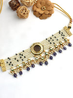 The Gold Tone Choker Necklace, adorned with simulated kundans and faux pearls, grey stone and beads. Crafted on a base of high-grade alloy metal. This necklace seamlessly combines classic charm with modern design, creating a statement piece that enhances your style and grace.