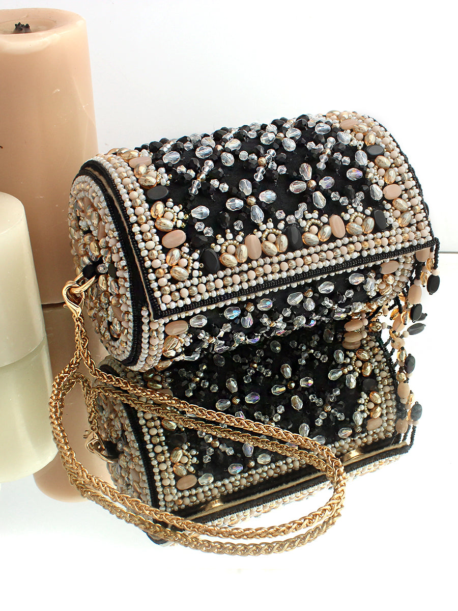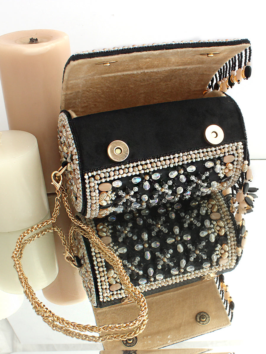Introducing Sameera, a one-of-a-kind flap-over clutch crafted from rich velvet and exquisitely hand-embroidered with shimmering crystal beads. Designed with a sleek chain handle, this statement piece offers both elegance and versatility, making it perfect for special occasions.
