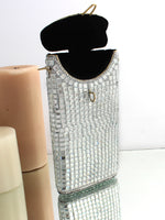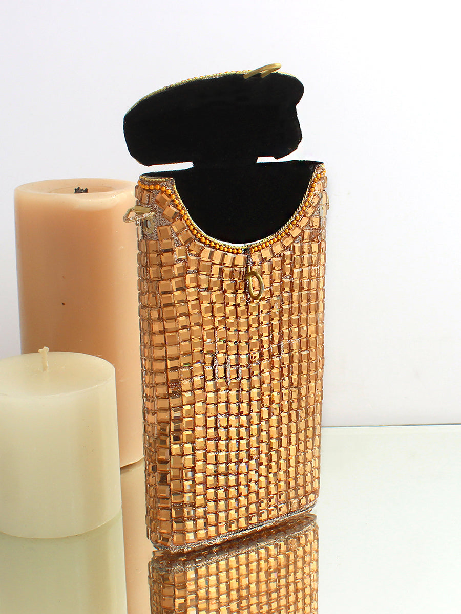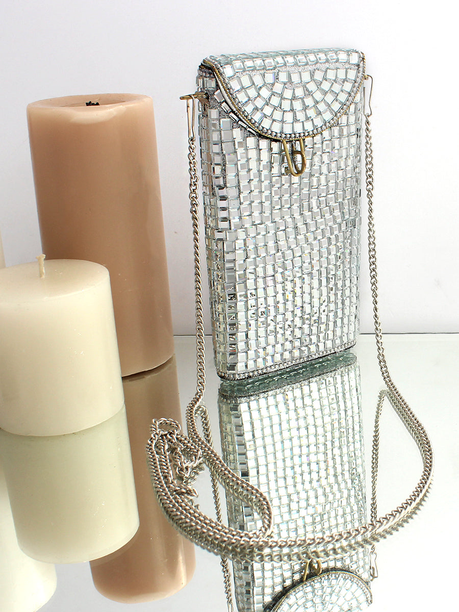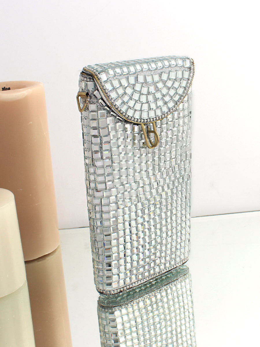 The Ashly mobile sling bag features elegant kundan stones and glitter embellishments for a timeless, sophisticated look. Designed with a secure clasp lock and a detachable chain, it can be styled as a handheld clutch or worn as a sling. Lightweight and compact, it comfortably holds essentials like your phone, cards, and keys—perfect for weddings, parties, and special occasions.