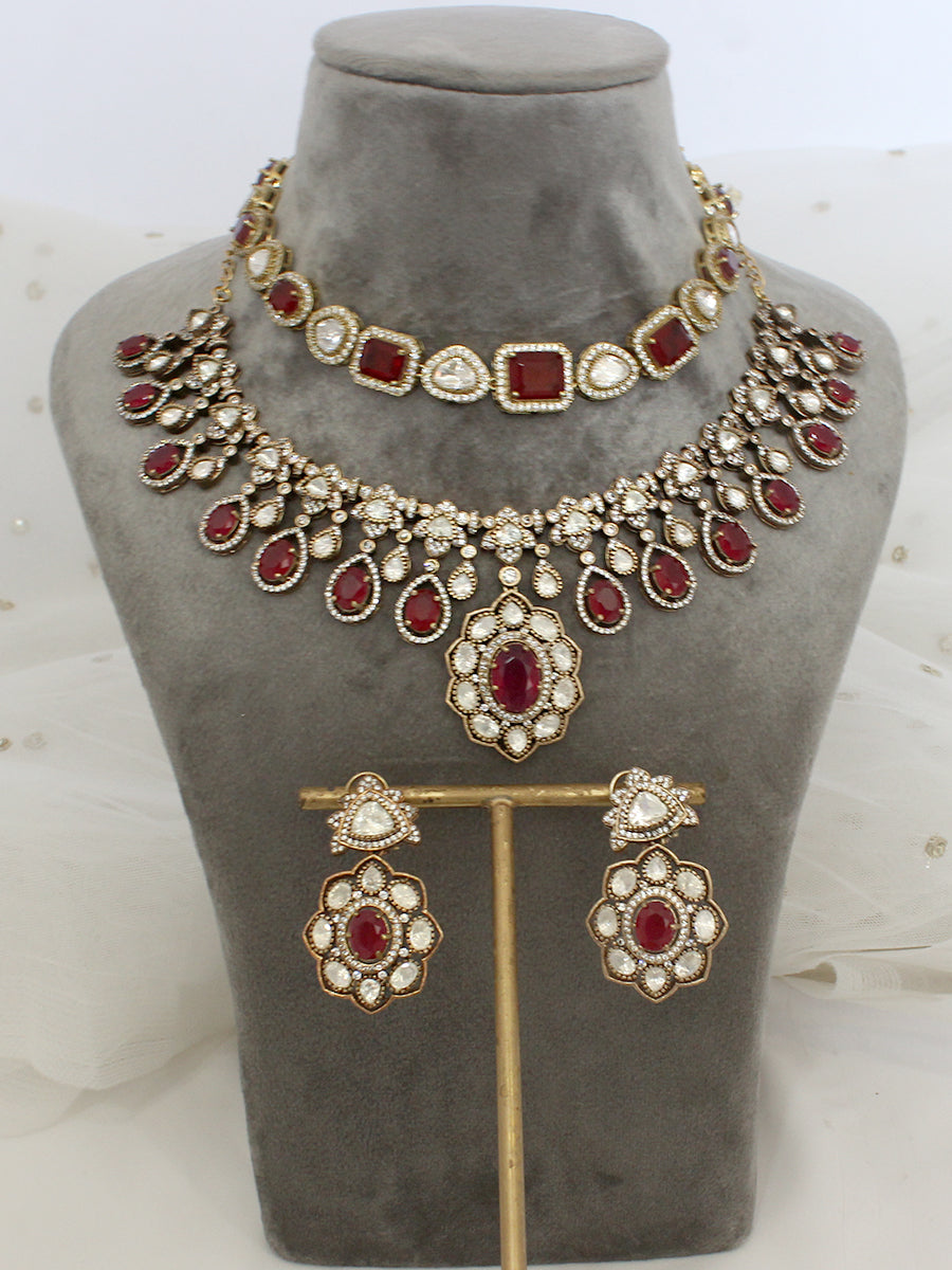 A beautifully detailed choker featuring green and maroon stones, highlighted with sparkling simulated Polkis and CZs.