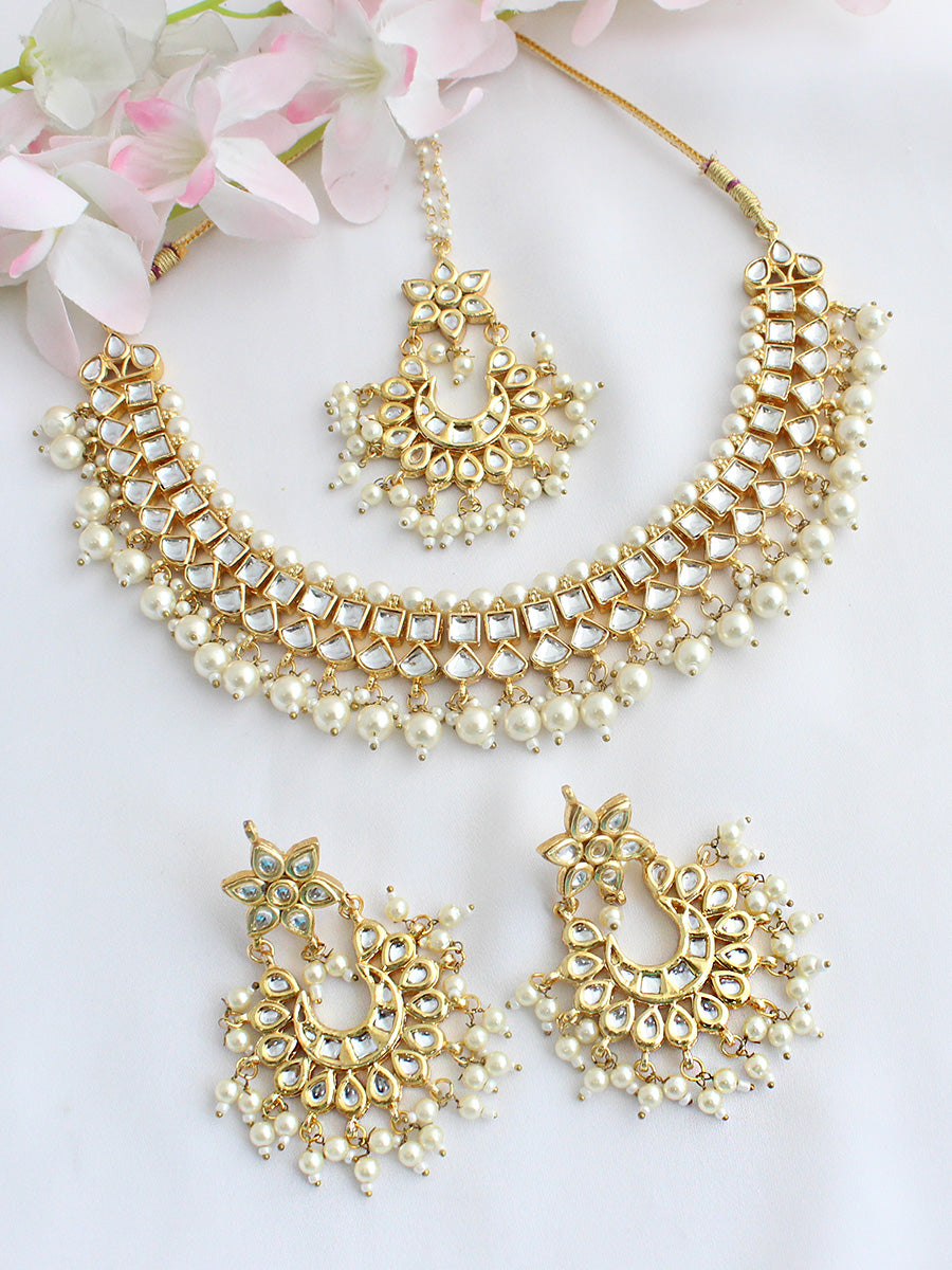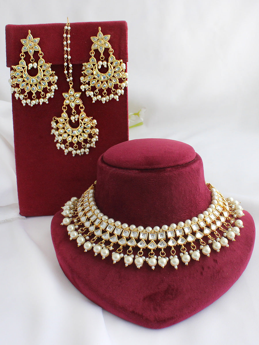 Step into timeless elegance with this majestic Gold-Tone Kundan Necklace Set, a tribute to traditional Indian jewelry artistry. Designed for the modern woman who appreciates heritage, this three-piece set features a necklace, matching earrings, and a maang tikka, all lavishly studded with simulated kundan stones and luminous faux pearl beads. Every detail is thoughtfully crafted to deliver regal beauty and sophistication. Whether you're a bride, bridesmaid, or attending a special celebration, this set adds an unmistakable charm to any ethnic ensemble. The intricate craftsmanship, combined with the warmth of gold and the shimmer of kundan, makes it a showstopper piece.