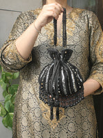 Introducing our Tavisha Handcrafted Embellished Bag. Handcrafted with intricate sequins, sparkling CZs accents, and delicate beadwork, the Tavisha bag is the perfect accessory to elevate any occasion. Its secure drawstring closure keeps your essentials safe, while its elegant design effortlessly complements both festive and formal outfits. this bag adds a touch of timeless charm to every ensemble.