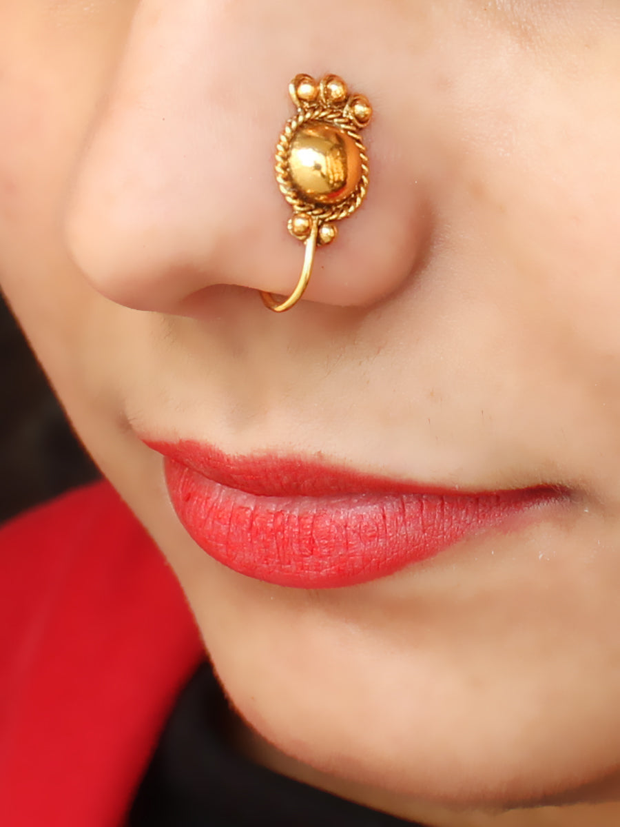 This nose ring is crafted to capture the essence of South Indian jewelry, and its clip-on design makes it convenient for those who prefer not to pierce their nose. The gold-plated finish adds a touch of sophistication to the overall look.