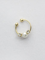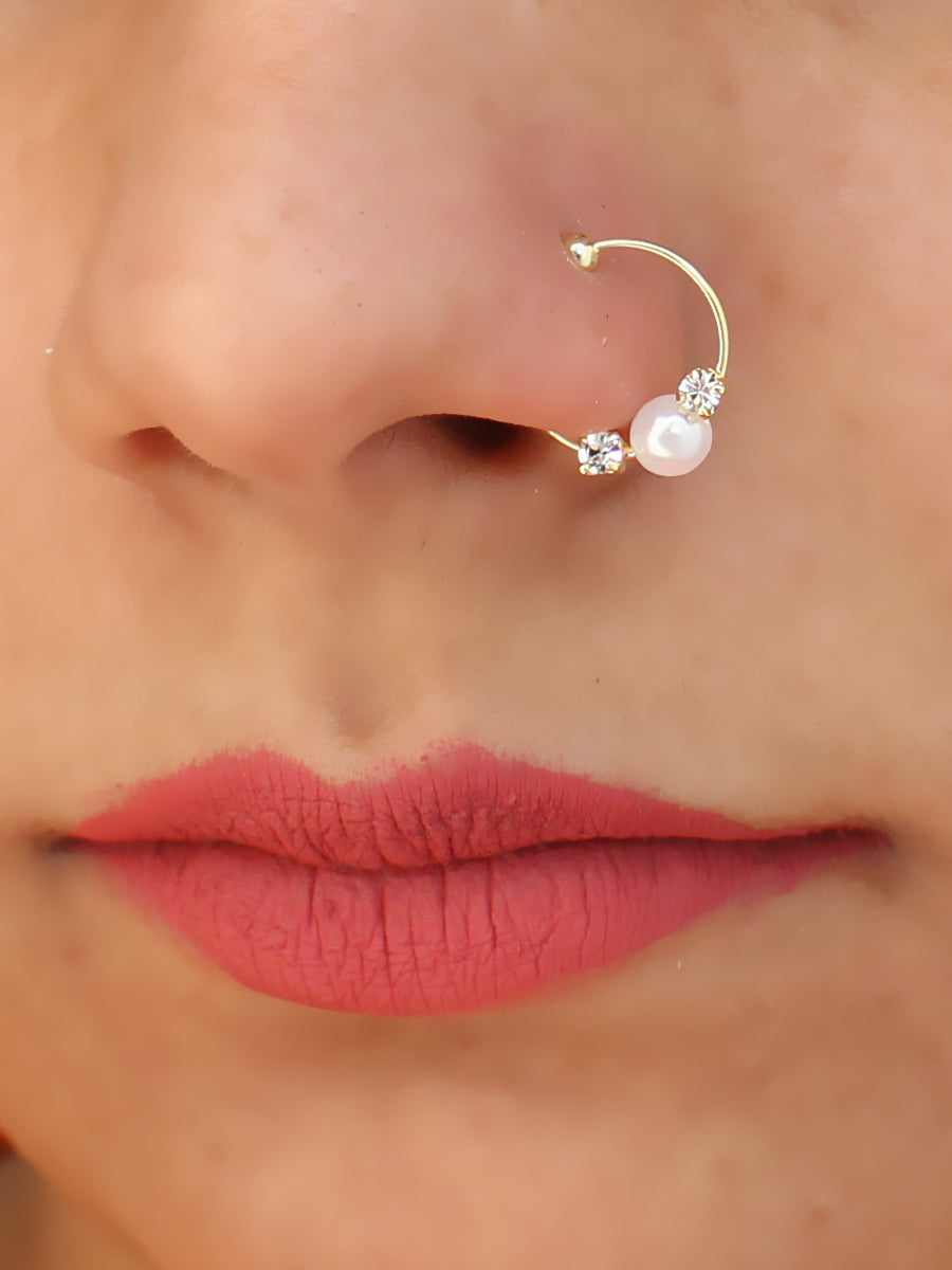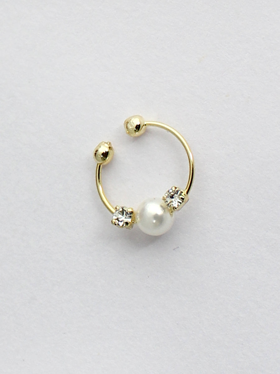Gold Tone Nose Ring Embellished with CZs & Pearls. Features an adjustable, open-ended design, eliminating the need for nose piercing. Crafted from high-grade alloy metal. Size: 10mm or 1/2", Length: 10mm or 1/2".