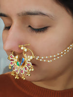 Gold Plated Nose Ring Studded with Simulated Kundan, Blue, Green, Pink Stones, Faux Pearls and Golden Beads.
