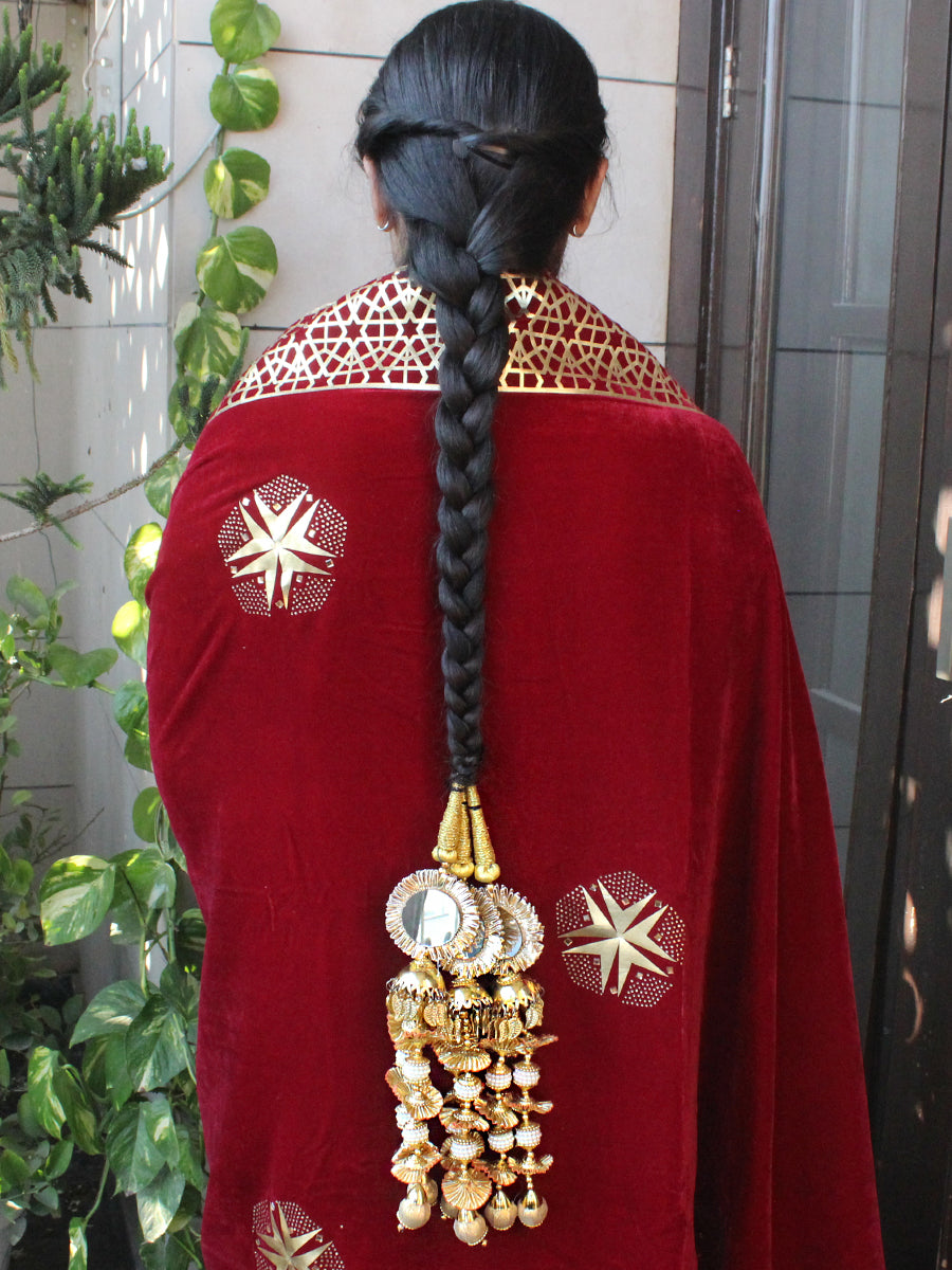 Add a regal Punjabi touch to your look with this handcrafted designer Parandi, beautifully embellished with gota patti, mirror work, and elegant pearl lines. Made from premium silk threads, this parandi enhances your braid with a rich, festive charm. Perfect for weddings, mehndi, sangeet, cultural events, and traditional dance performances like Giddha and Bhangra.
