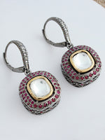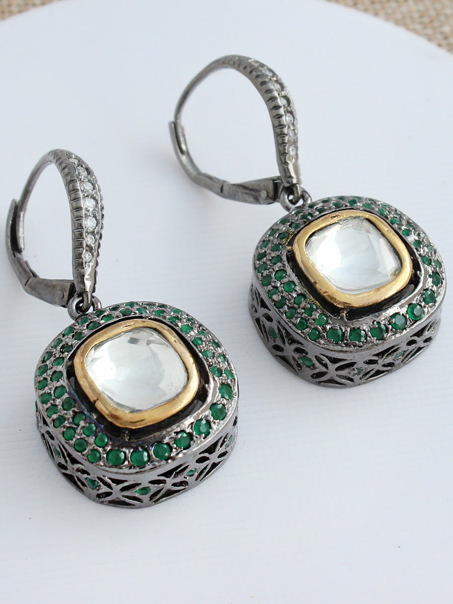 Antique Silver Tone Earrings with Simulated Polki, Simulated Diamonds, and Blue CZs