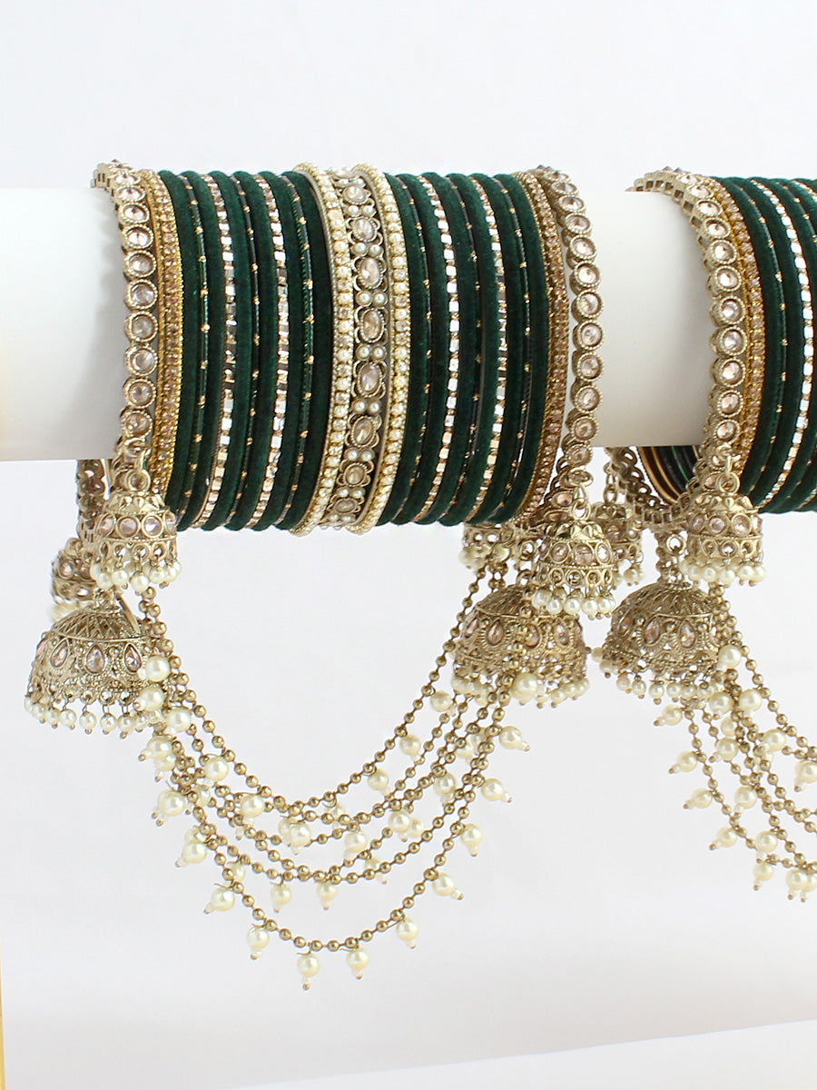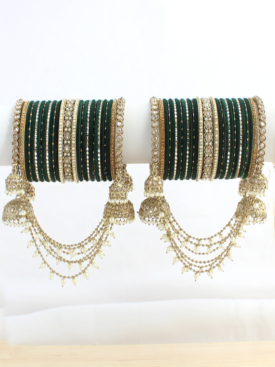 The 34 Piece (2 Set) Bangle Set, Add a regal charm to your traditional ensemble with these beautiful green Polki bangles, featuring elegant hanging Jhumki, delicate stone fall detailing, and sparkling Cubic Zirconia (CZ) stones.