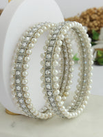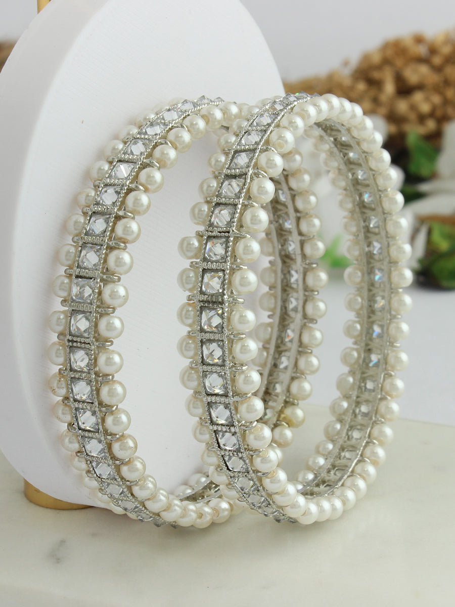 The set includes one pair of silver bangles studded with simulated polki and faux pearls. The base is made of high-grade alloy metal.
