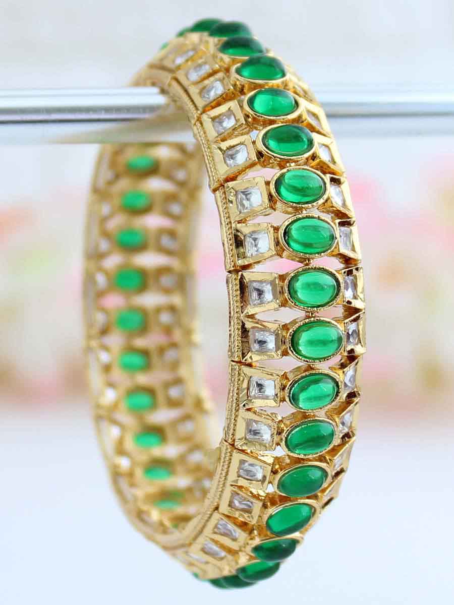 1 Pc Gold Tone Stretchable Bangle Studded with Simulated Kundan and Green stones.