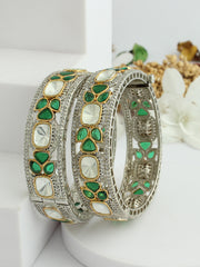 Elevate your accessory collection with these Two Tone Bangles adorned with simulated polki diamonds, CZs, and vibrant green and ruby pink stones. The versatile design and combination of colors make these bangles a perfect choice for various occasions, adding a touch of elegance and tradition to your ensemble.