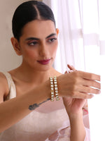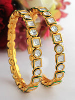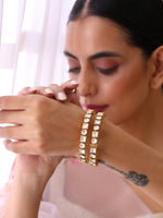 These bangles, adorned with simulated Kundans, add a touch of elegance and traditional charm to your attire. The gold plating enhances the richness of the design, making them suitable for various occasions, especially festive and celebratory events. The high-grade alloy metal ensures durability and a polished finish. These bangles are not just accessories; they are a statement piece that can complement your ethnic or traditional outfits beautifully.
