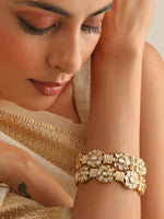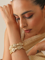 Elevate your accessory collection with this exquisite gold-plated screw opening bangle. Adorned with simulated polki diamonds and lustrous pearl beads, this bangle strikes a perfect balance between elegance and sophistication.