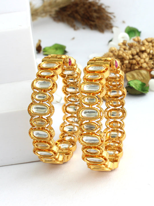 The Gold Plated Screw Opening Bangle Studded with Simulated Polki Diamonds is an exquisite piece of jewelry. Here are the details: